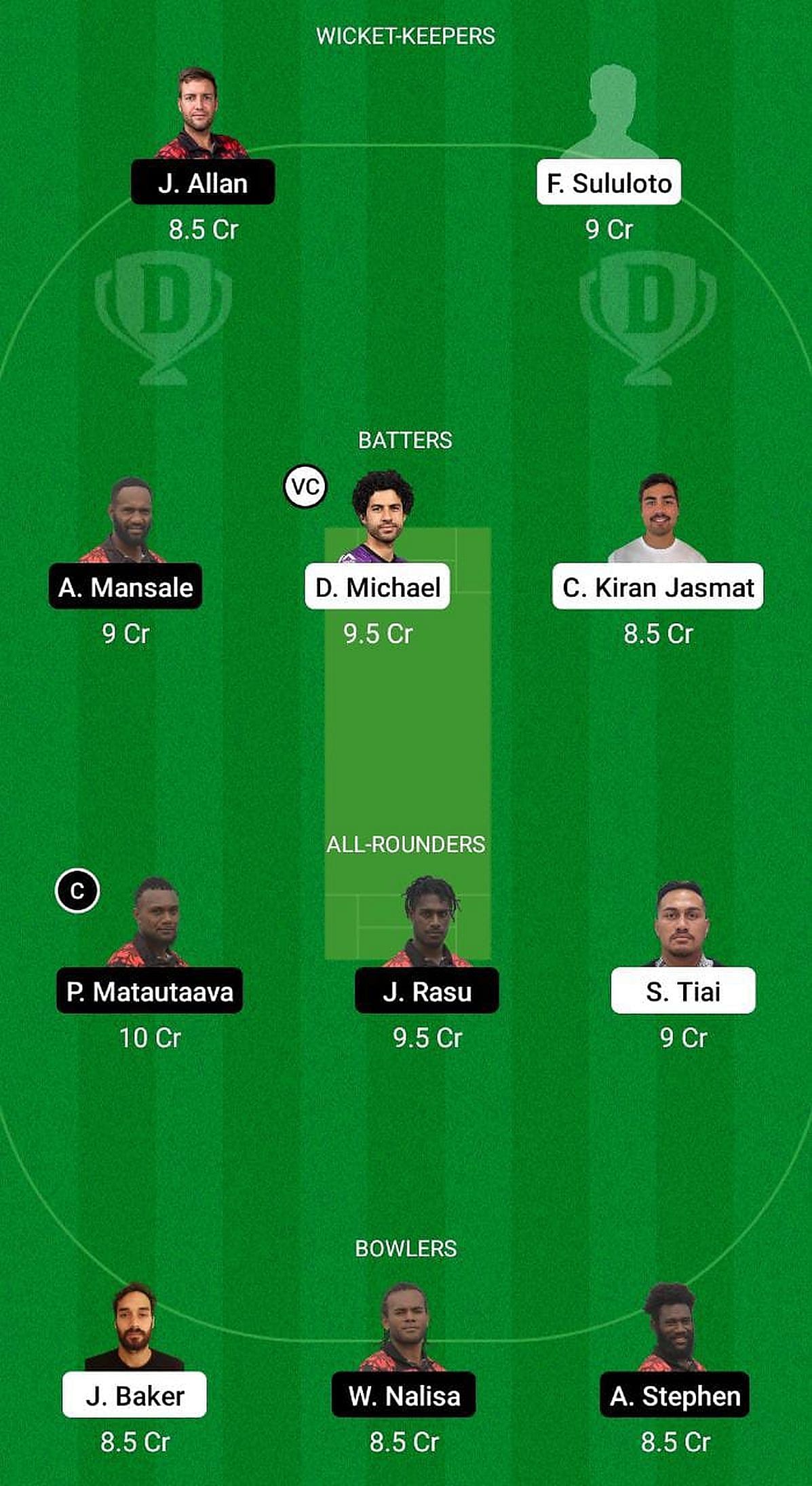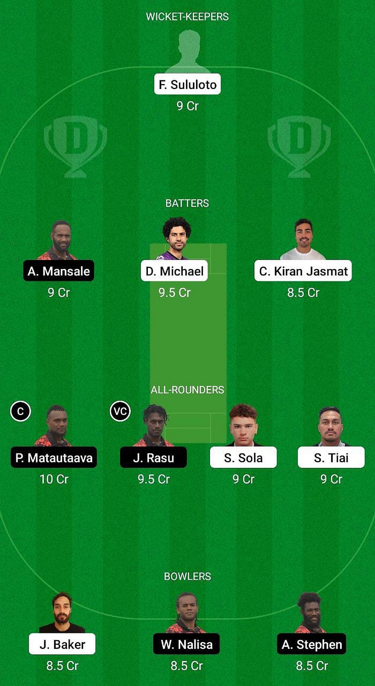 Sean Cotter, Uala Kaisala (wk), Dom Michael, Saumani Tiai, Caleb Jasmat, Fereti Sululoto, Andrew Michael, James Baker (c), Samson Sola, Douglas Finau, Uili Sofi.