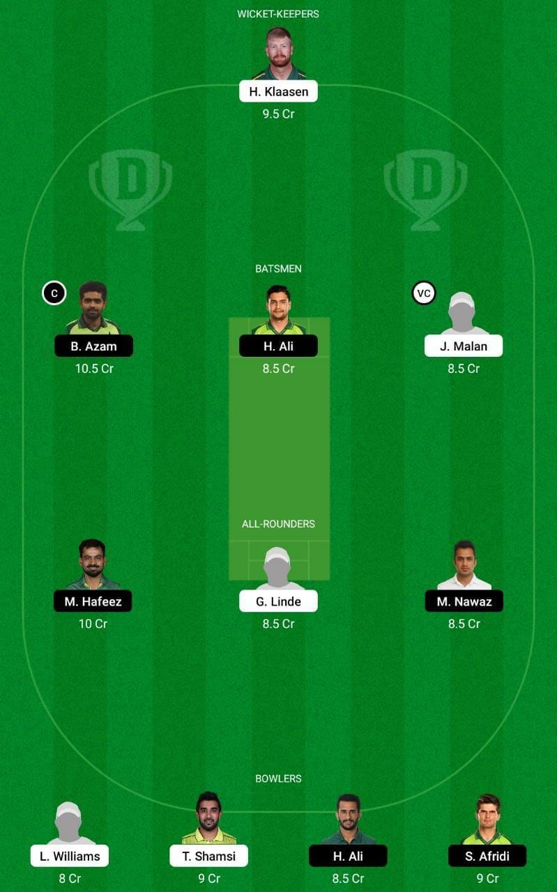 Fantasy Suggestion #1: Heinrich Klaasen, Babar Azam, Hasan Ali, Janneman Malan, Mohd Hafeez, George Linde, Mohammad Nawaz, Lizaad Williams, Tabriaz Shamsi, Hasan Ali and Shaheen Afridi