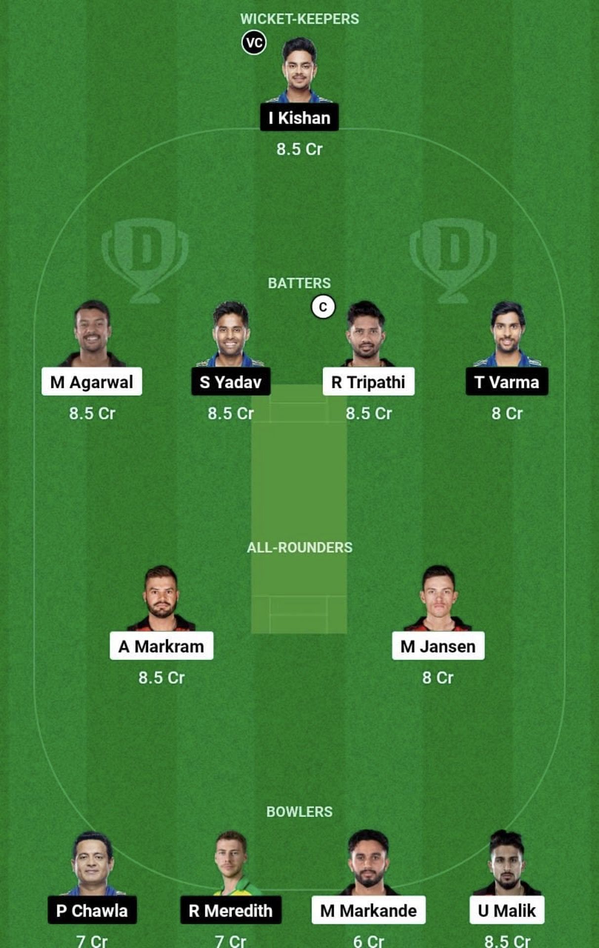 Bowlers: Piyush Chawla, Mayank Markande, Riley Meredith, Umran Malik