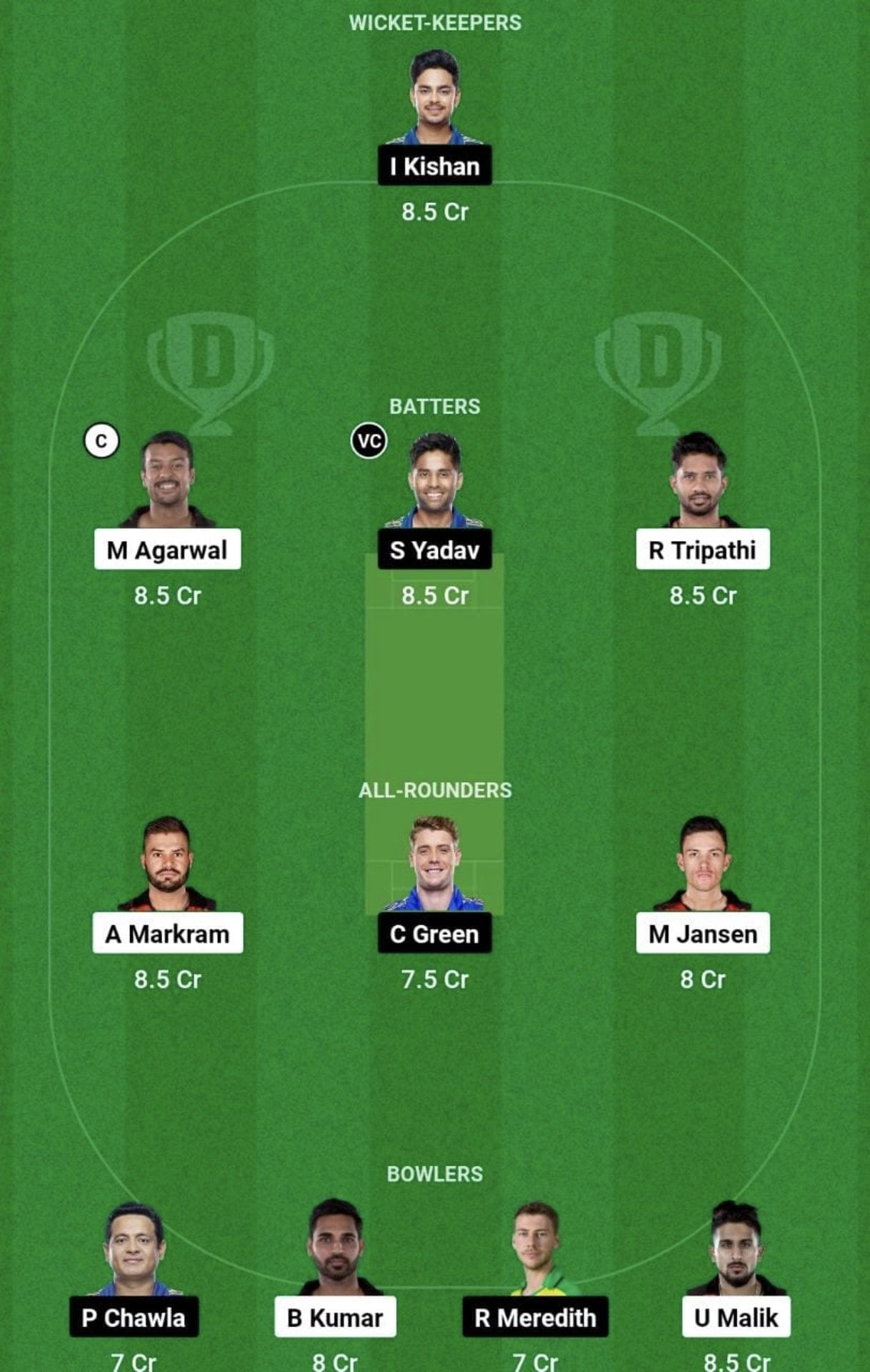Bowlers: Piyush Chawla, Bhuvneshwar Kumar, Riley Meredith, Umran Malik