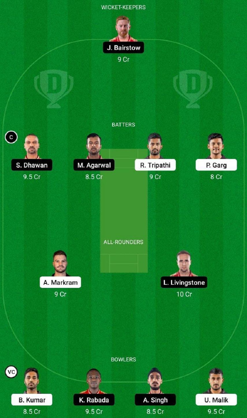 Fantasy Suggestion #1: Jonny Bairstow, Shikhar Dhawan, Mayank Agarwal, Rahul Tripathi, Priyam Garg, Aiden Markram, Liam Livingstone, Bhuvneshwar Kumar, Umran Malik, Arshdeep Singh and Kagiso Rabada.