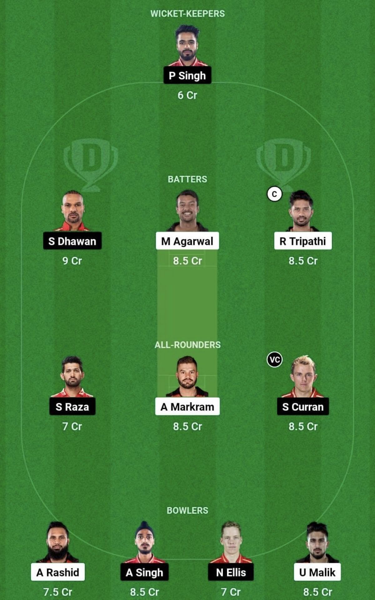 Mayank Agarwal, Anmolpreet Singh (wk), Rahul Tripathi, Harry Brook, Aiden Markram (c), Abdul Samad/Heinrich Klaasen, Washington Sundar, Adil Rashid, Bhuvneshwar Kumar, Umran Malik and T Natarajan.