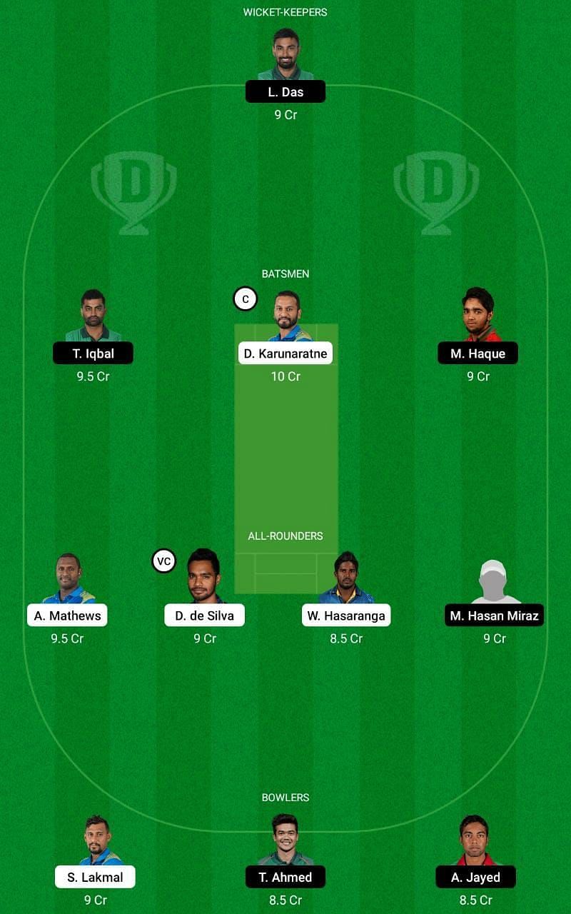Fantasy Suggestion #1: L Das, D Karunaratne, T Iqbal, M Haque, D de Silva, W Hasaranga, M Hasan Miraz, A Mathews, S Lakmal, T Ahmed and A Jayed