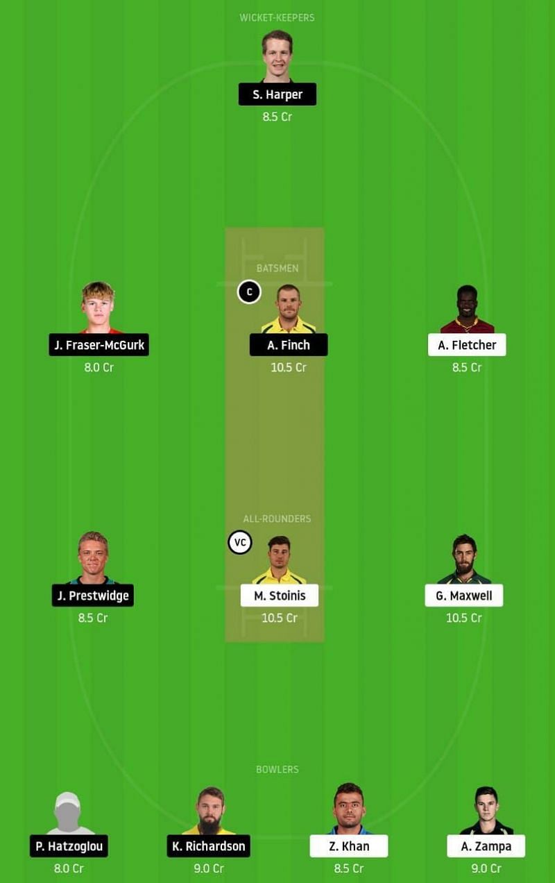 Fantasy Suggestion #1: Sam Harper, Jake Fraser McGurk, Aaron Finch, Andre Fletcher, Jack Prestwidge, Marcus Stoinis, Glenn Maxwell, Peter Hatzoglou, Kane Richardson, Zahir Khan and Adam Zampa.