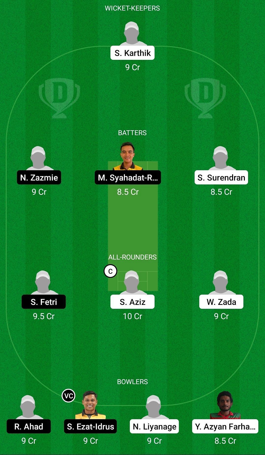 Sidharth Karthik (wk), Harinderjit Singh Sekhon, Shankar Sathish, Sharveen Surendran, Niroshan de Silva (c), Syed Aziz, Wahib Zada, Sharvin Muniandy, Shivnarin Rajaratnam, Neville Liyanage, Yoosuf Azyan Farhath.