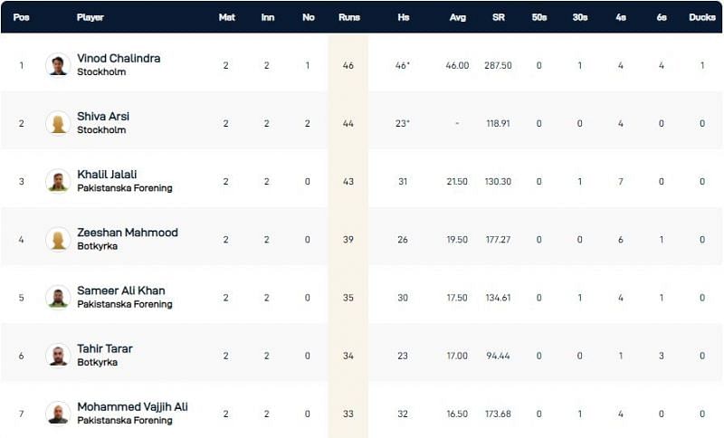Vinod Chalindra of Stockholm is the highest run-scorer after the first day of action in the Stockholm T10 League 2021. He played an unbeaten 46-run knock apart from a duck in the other encounter. Chalindra has an outstanding strike rate of 287.50 and has struck four boundaries and as many sixes.