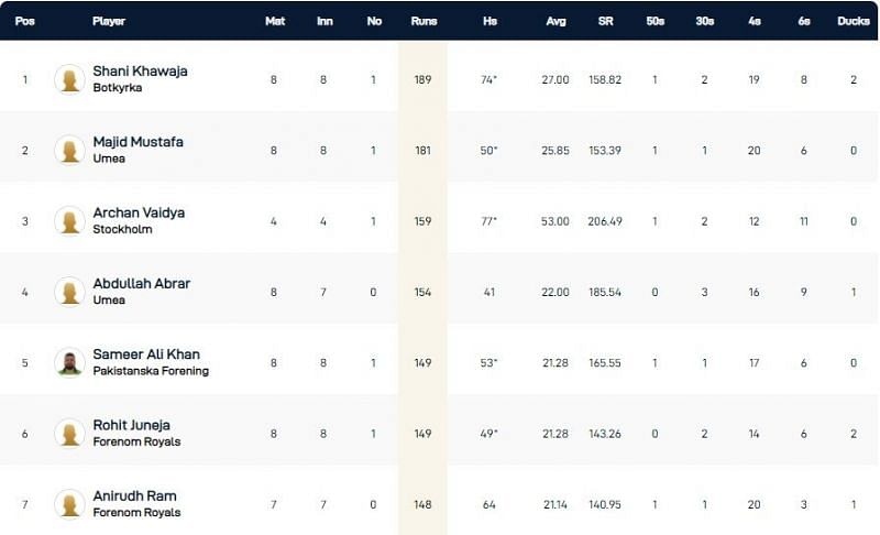 Shani Khawaja of Botkyrka has emerged as the highest run-scorer after the fifth day of action in the Stockholm T10 League 2021. He has amassed 189 runs in eight encounters, with an unbeaten 74 being his highest score. Khawaja's runs have come at a strike rate of 158.82, and are studded with 19 fours and eight sixes.