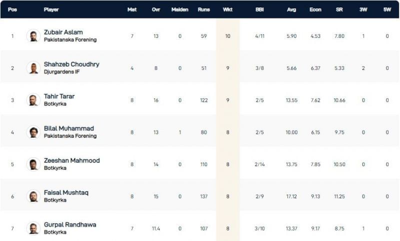 Zubair Aslam of Pakistanska Forening, with 10 scalps to his credit, continues to be the highest wicket-taker after Day 7 of the Stockholm T10 League 2021. He has a spell of 4/11 as his best performance and has an exceptional economy of 4.53.