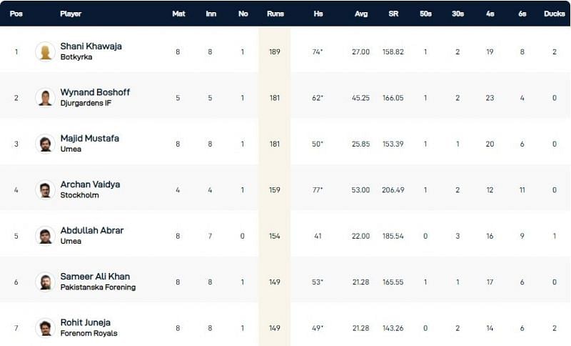 Wynand Boshoff of Djurgardens IF has jumped to second spot on the run-scoring charts. He has amassed 181 thus far, with an unbeaten 62 being his best effort. Boshoff has scored his runs at an impressive strike rate of 166.05, with the help of 23 fours and four maximums.