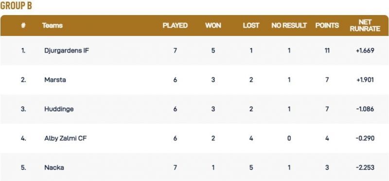 Djurgardens IF continue to be perched atop the Group B points table of the Stockholm T10 League 2021, with 11 points to their credit. They have emerged victorious in five of their seven matches to date, with the other point accruing through an abandoned encounter.
