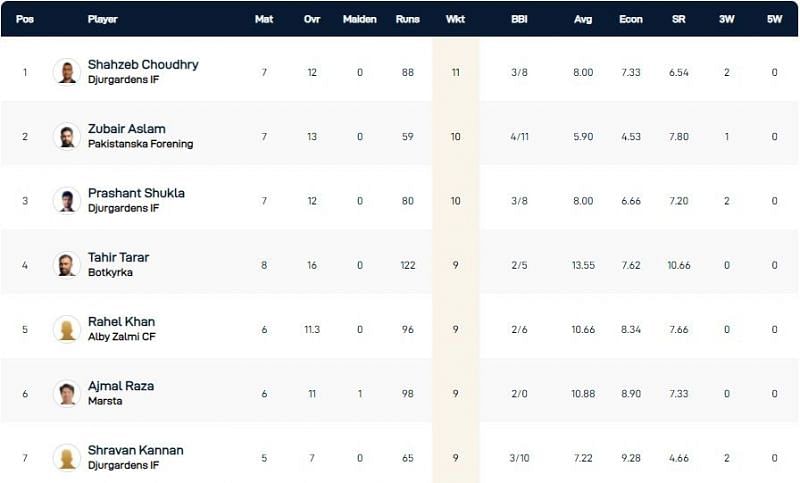 Other than Choudhry and Shukla, Alby Zalmi CF's Rahel Khan (9) and Azam Khalil (7), Marsta's Ajmal Raza (9), Hamid Sulehri (6) and Sweed Ullah (5), Djurgardens IF's Shravan Kannan (9) and Ankit Dubey (5), Nacka's Zabi Zahid (6), and Huddinge's Saeed Ahmed (5) and Nasir Iqbal (3) are the most successful bowlers from their respective teams.
