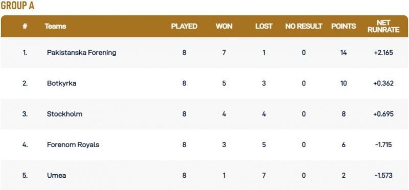 Following are the team standings in the two groups after the ninth day of matches in the Stockholm T10 League 2021: