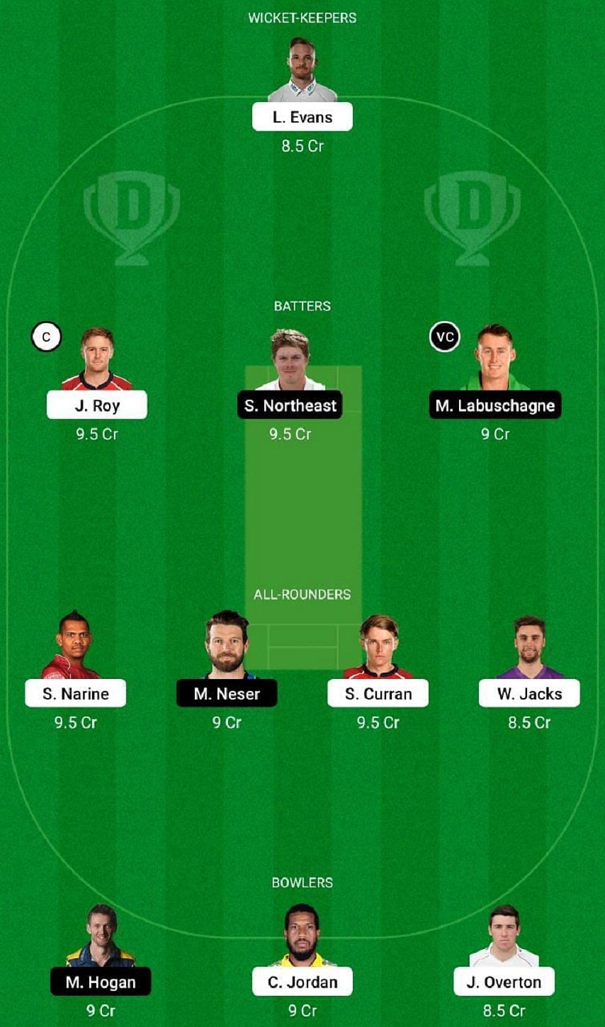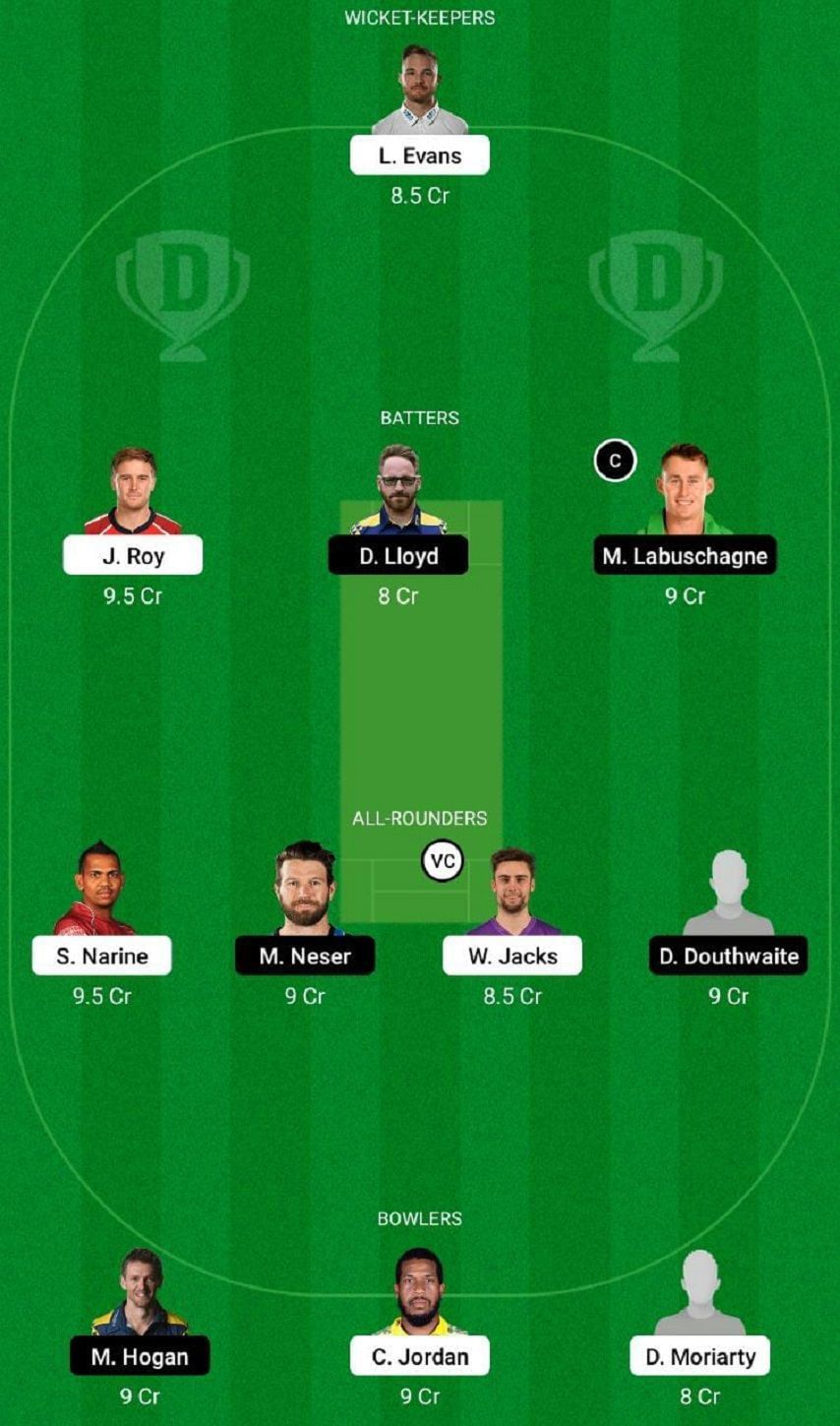 Fantasy Suggestion #2: Laurie Evans, Jason Roy, David Lloyd, Marnus Labuschagne, Sunil Narine, Michael Neser, Daniel Douthwaite, Will Jacks, Michael Hogan, Chris Jordan and Daniel Moriarty