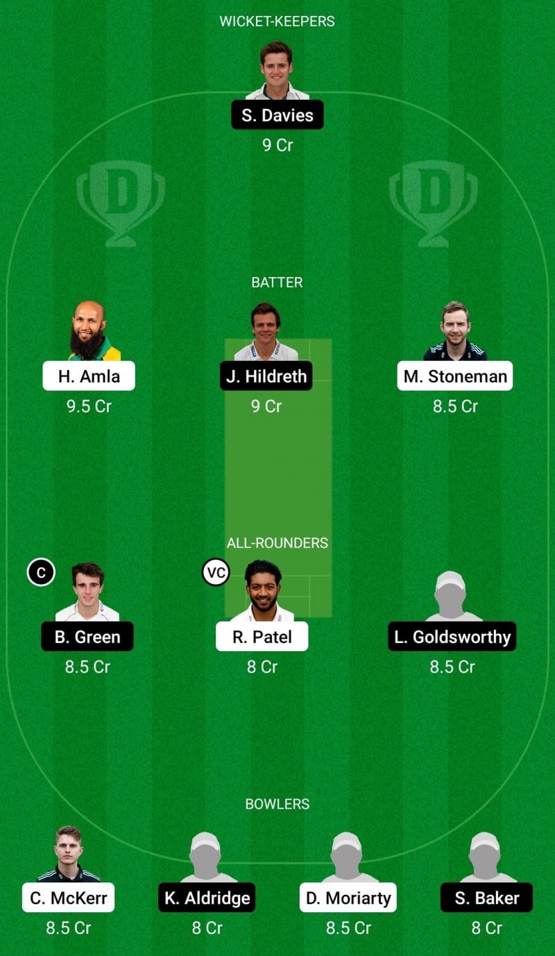 Fantasy Suggestion #1: Steven Davies, Hashim Amla, James Hildreth, Mark Stoneman, Ben Green, Ryan Patel, Lewis Goldsworthy, Conor McKerr, Kasey Aldridge, Daniel Moriarty, Sonny Baker