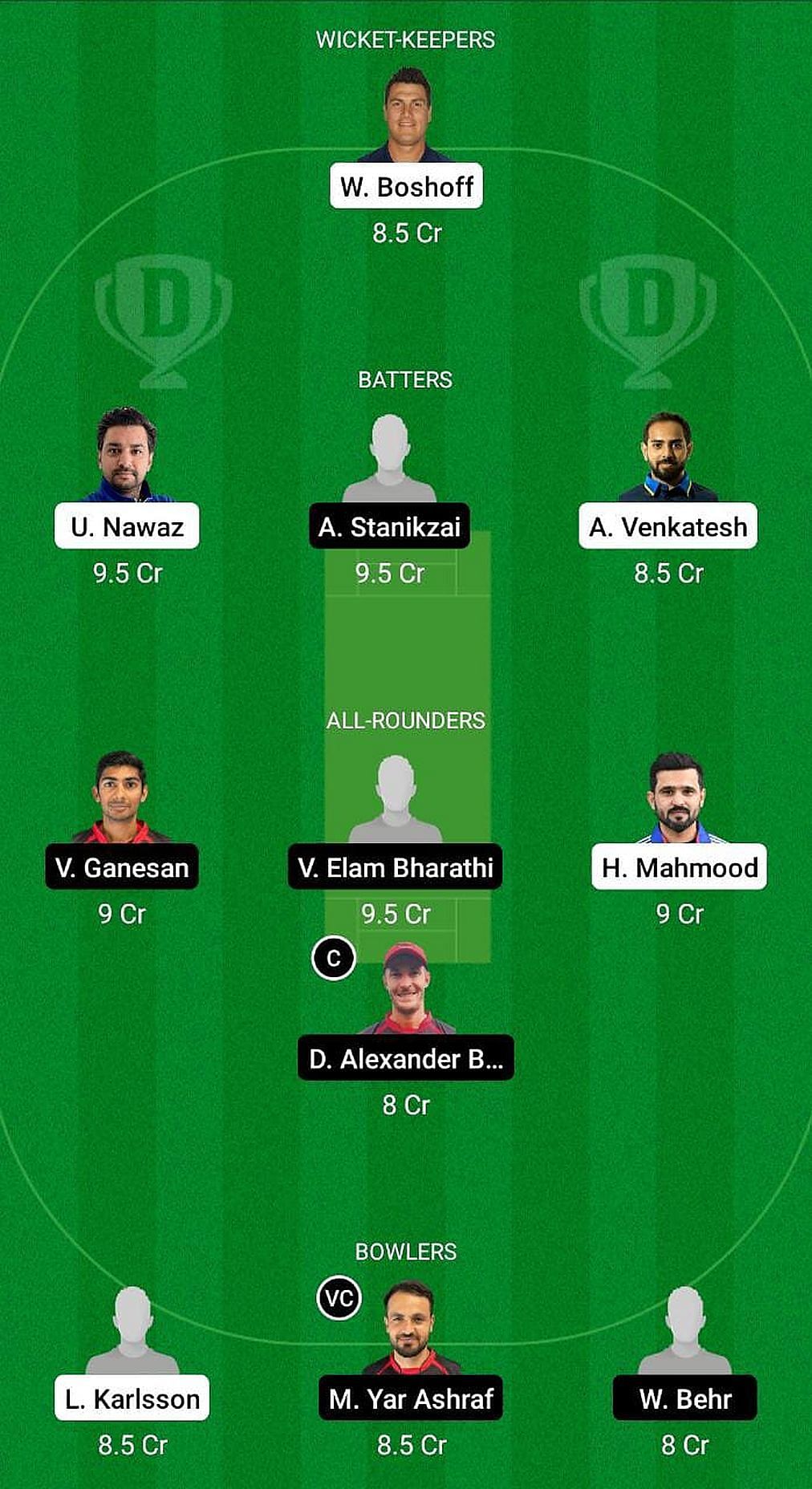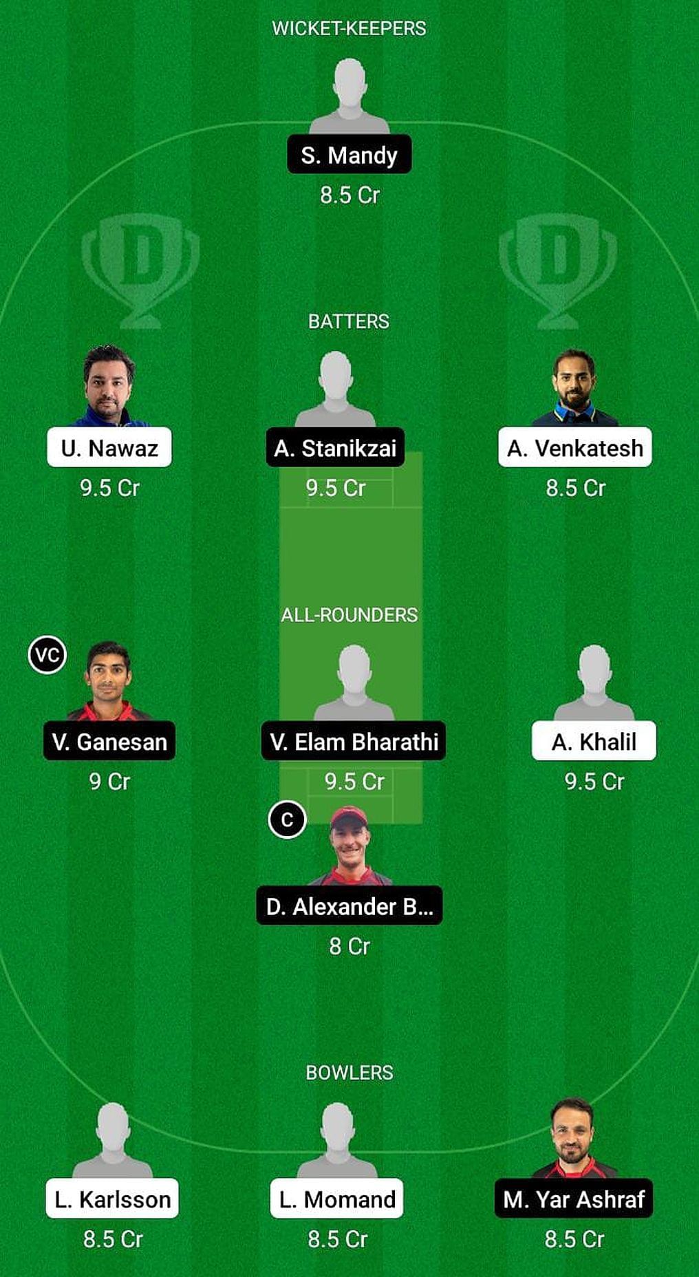 Fantasy Suggestion #1: Sachin Mandy, Umar Nawaz, Abdul Stanikzai, Abhijit Venkatesh, Venkatraman Ganesan, Sri Vishnu Barathi, Azam Khalil, Dylan Blignaut, Muslim Ashraf, Liam Karlsson, Lemar Momand.