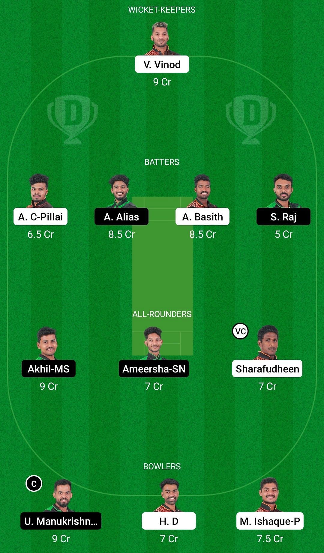 Batters: Akash C Pillai, Albin Alias, Abdul Basith, Sanjay Rai