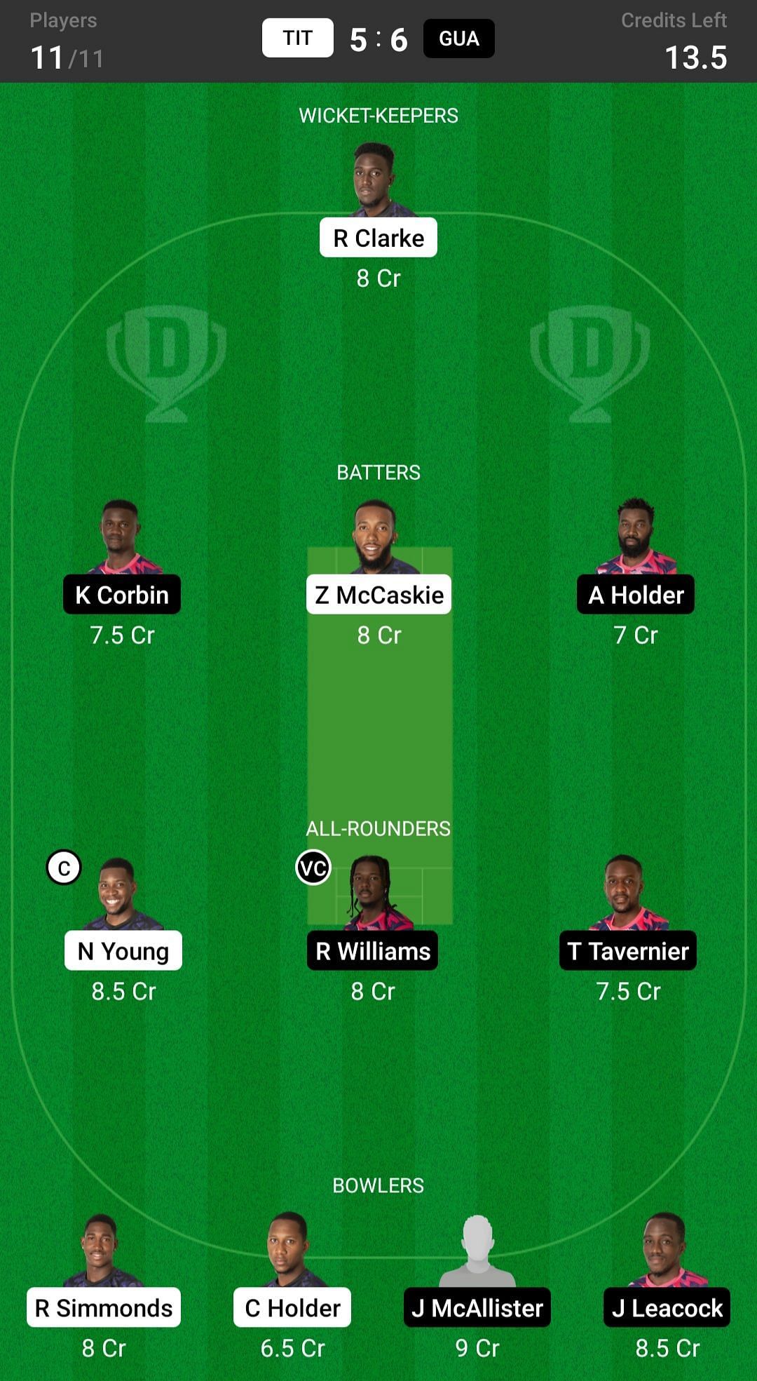 The Titans (TIT) will take on the Guardians (GUA) in the 12th game at the Barbados T10 on Sunday at the Three Ws Oval in Cave Hill. Ahead of the game, here's everything you must know about the TIT vs GUA Dream11 prediction, including fantasy cricket tips, playing XIs, best player picks and pitch report.