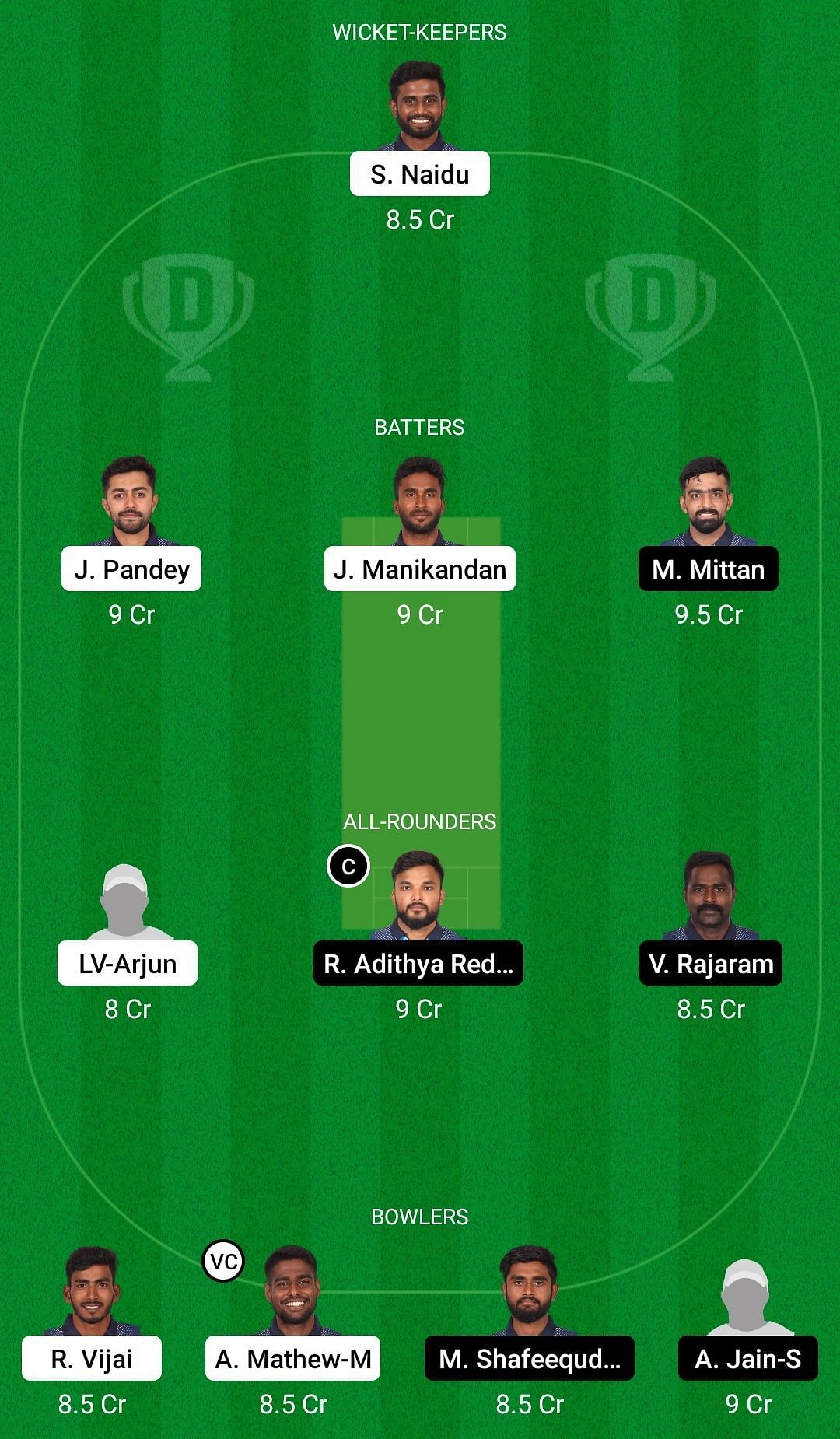 Fantasy Suggestion #2: Siddharth Naidu, Jay Pandey, Jayaprakash Manikandan, Mohit Mittan, LV Arjun, R Adithya Reddy, Vijay Rajaram, R Vijai, Abin Mathew M, Mohammed Shafeequddin, Akshay Jain S.