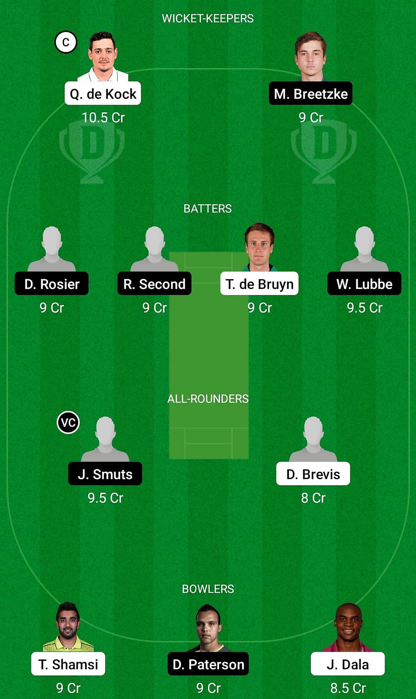 Fantasy Suggestion #1: Quinton de Kock, Matthew Breetzke, Diego Rosier, Rudi Second, Theunis de Bruyn, Wihan Lubbe, JJ Smuts, Dewald Brevis, Tabraiz Shamsi, Dane Paterson, Junior Dala.