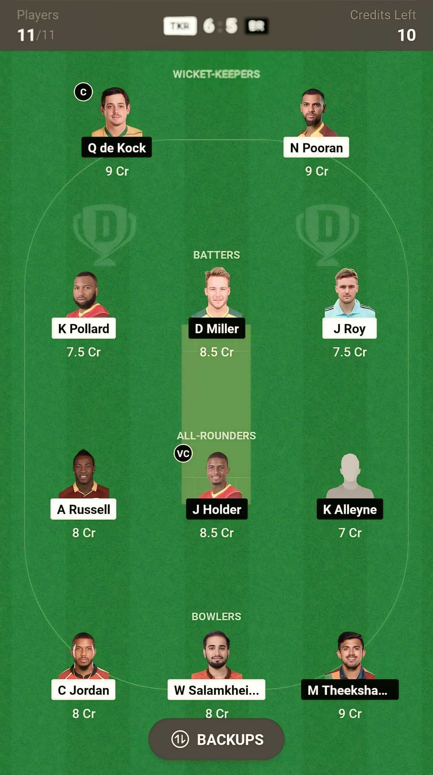 Andre Russell and Jason Holder are the best all-rounder picks for the Dream11 team. Both will play a crucial role for their teams in today's match. Holder has already smashed 89 runs and taken 9 wickets in the last nine matches. Kadeem Alleyne is another good all-rounder for today's nail-biting match.