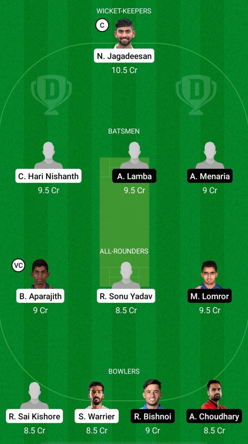 Fantasy Suggestion #1: N Jagadeesan, Hari Nishanth, Ankit Lamba, Ashok Menaria, Baba Aparajith, Sonu Yadav, Mahipal Lomror, Ravisrinivasan Sai Kishore, Sandeep Warrier, Aniket Choudhary, Ravi Bishnoi.