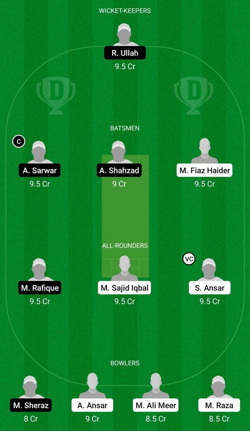 Fantasy Suggestion #1: Rehman Ullah, Adeel Sarwar, Abid Shahzad, Muhammad Fiaz Haider, Moazzam Rafique, Muhammad Sajid Iqbal, Sufian Ansar, Muhammad Sheraz, Aqeel Ansar, Muhammad Ali Meer, Mohsin Raza