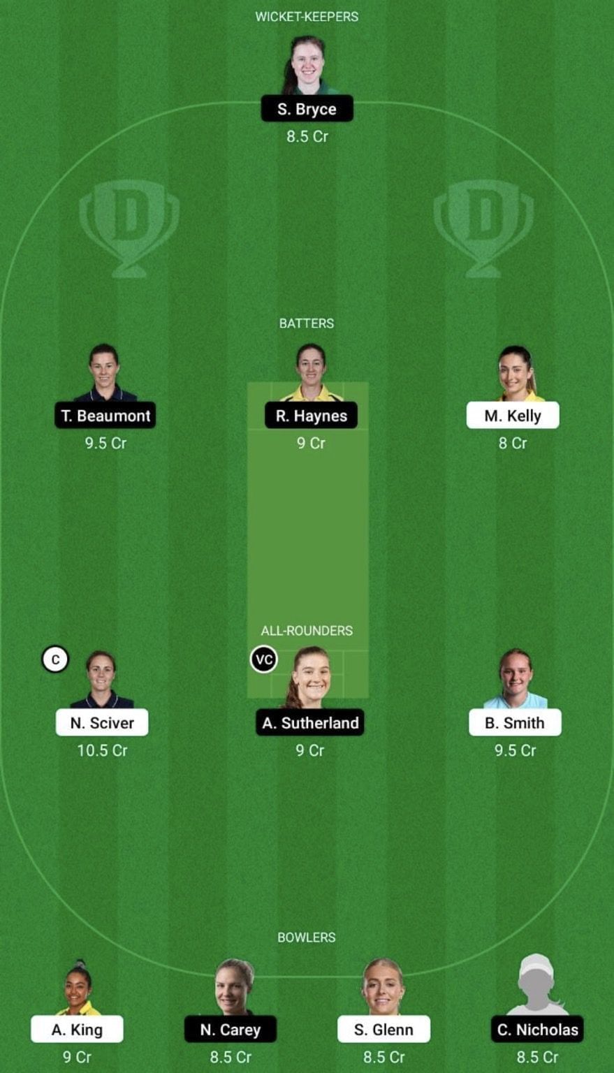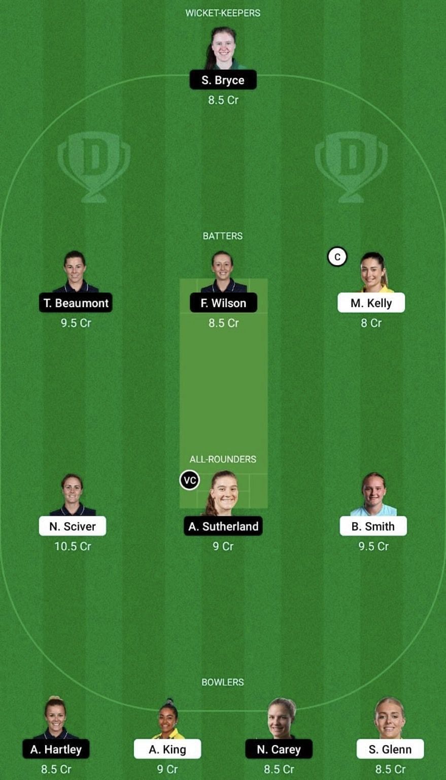 Allrounders: Natalie Sciver (c), Annabel Sutherland (vc), Bryony Smith