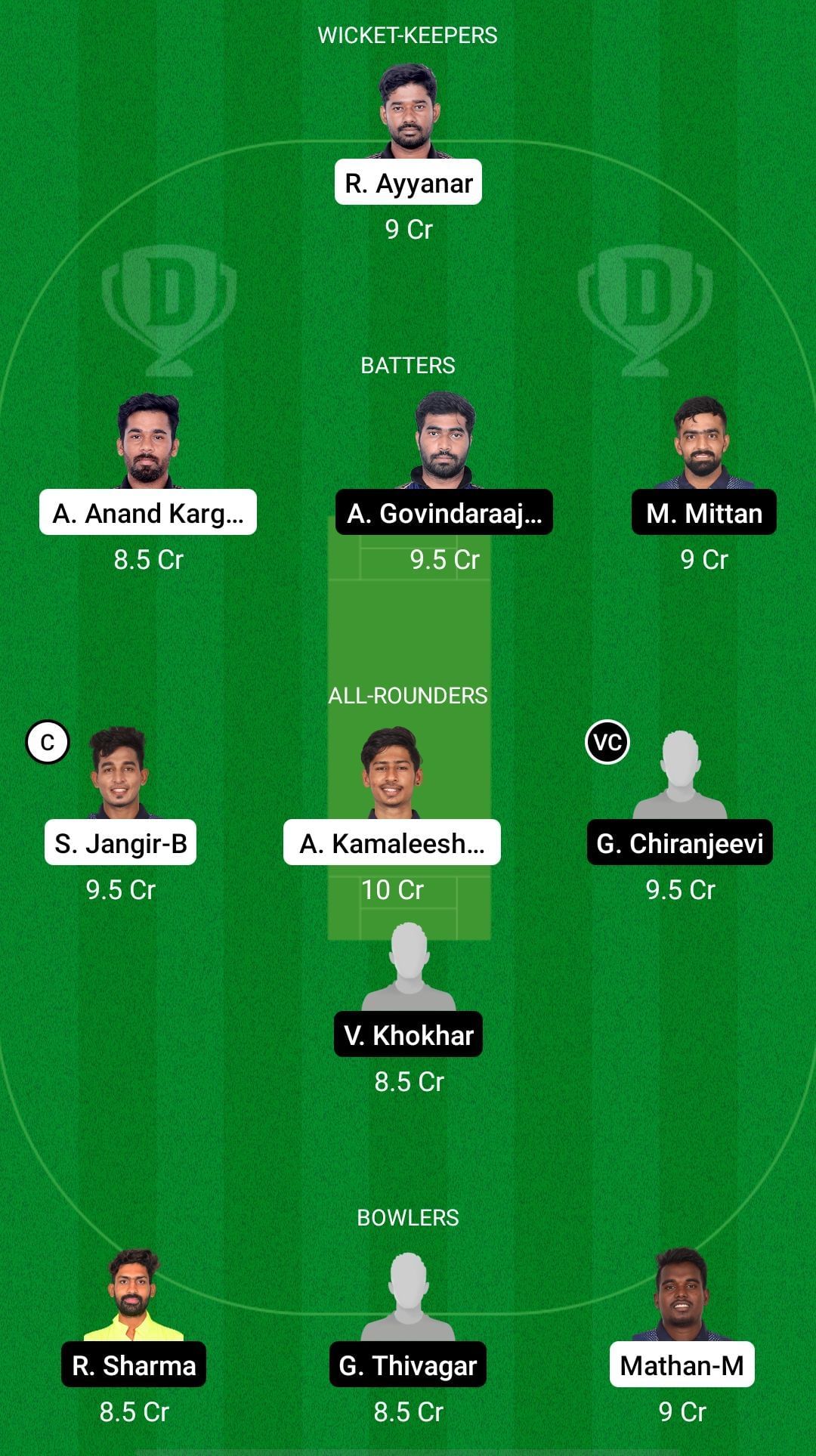 Fantasy Suggestion #2: R Ayyanar, Akash Anand Kargave, AS Govindaraajan, Mohit Mittan, Satish Jangir B, Kamaleeshwaran A, Gonnabattula Chiranjeevi, Vignesh K, Raghu Sharma, Thivagar G, Santhamoorthy S.