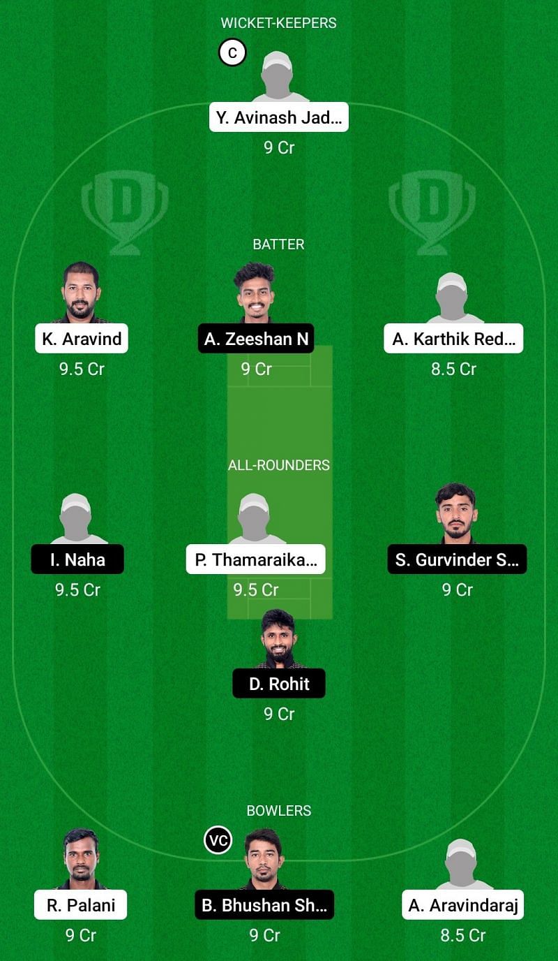Fantasy Suggestion #2: Yash Avinash Jadhav, K Aravind, Ameer Zeeshan N, Aleti Karthik Reddy, Iqlas Naha, P Thamaraikannan, Sidak Gurvinder Singh, Damodaran Rohit, R Palani, Bharat Bhushan Sharma, Aravindaraj A