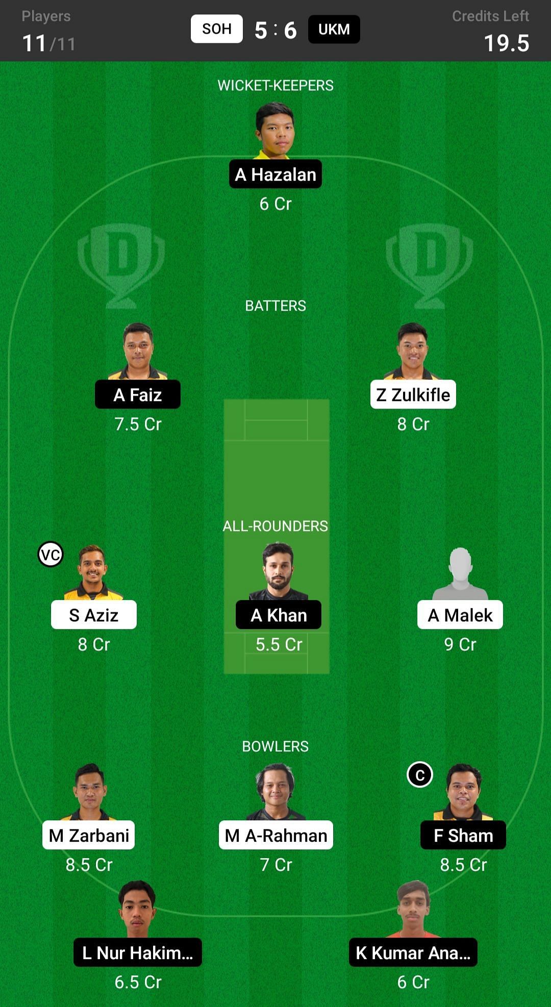 The top bowler picks are M Zarbani and F Sham. Both have bowled brilliantly in the last few games and are also expected to bowl at the death. L Nur Hakim is another good pick.