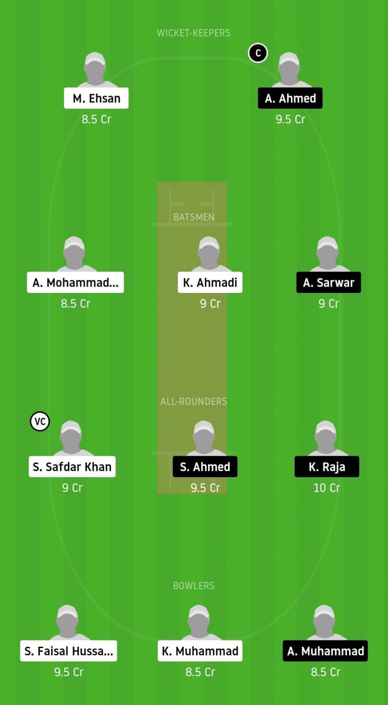 Fantasy Suggestion #1: Muhammad Ehsan, Awais Ahmed, Aziz Mohammad, Khalid Ahmadi, Adeel Sarwar, Sumair Safdar Khan, Shahbaz Ahmed, Kamran Raja, Syed Faisal Hussain, Muhammad Kamran, Tanveer Iqbal.