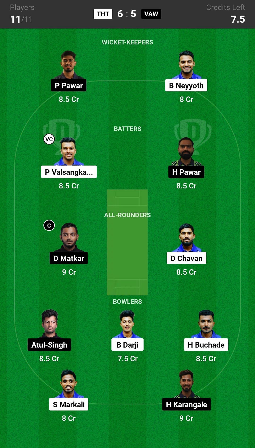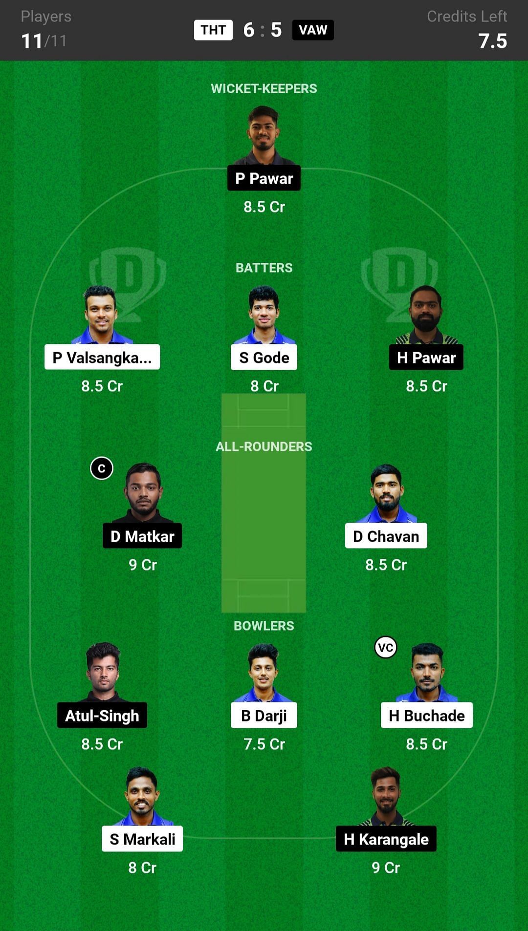 P Valsangkar and H Pawar are the two best batsmen picks for the Dream11 team. S Gode played exceptionally well in the last match, so he is also a good pick for today's Dream11 fantasy team.