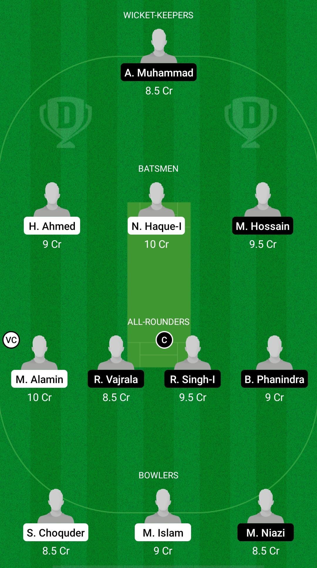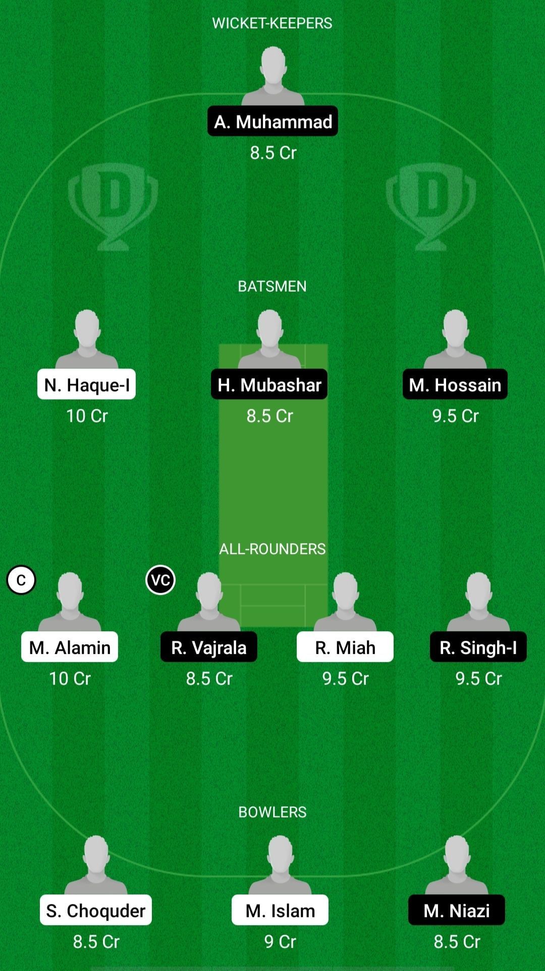 Fantasy Suggestion #1: Arif Muhammad, Nazmul Haque, Hassan Mubashar, Mubarak Hossain, Miah Alamin, Vajrala Reddy, Rajib Miah, Rajwinder Singh, Shagar Choquder, Mahmudul Islam, Muneeb Niazi.
