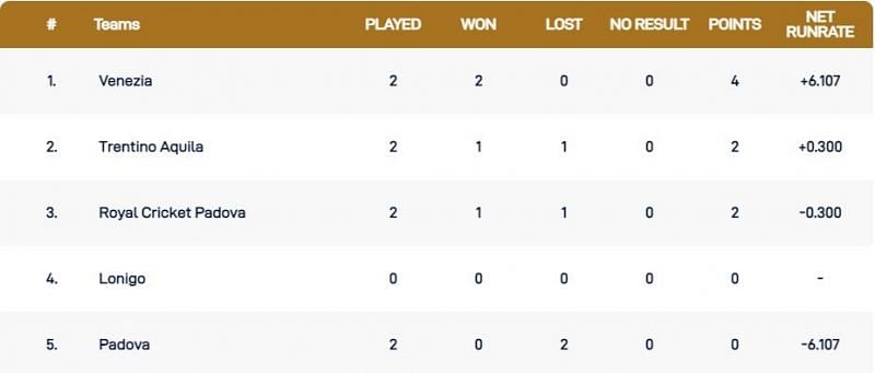 Trentino Aquila and Royal Cricket Padova shared the two encounters they played against each other. The two teams have a couple of points apiece, with the former placed higher due to their better net run rate.