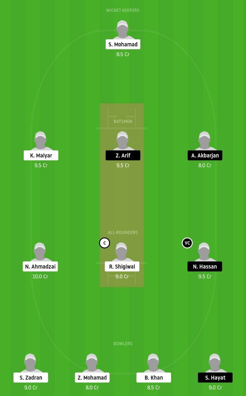 Fantasy Suggestion #1: S Mohamed, K Malyar, Z Arif, A Akbarjan, R Shigiwal, N Ahmadzai, N Hassan, S Hayat, S Zadran, Z Mohamed and B Khan