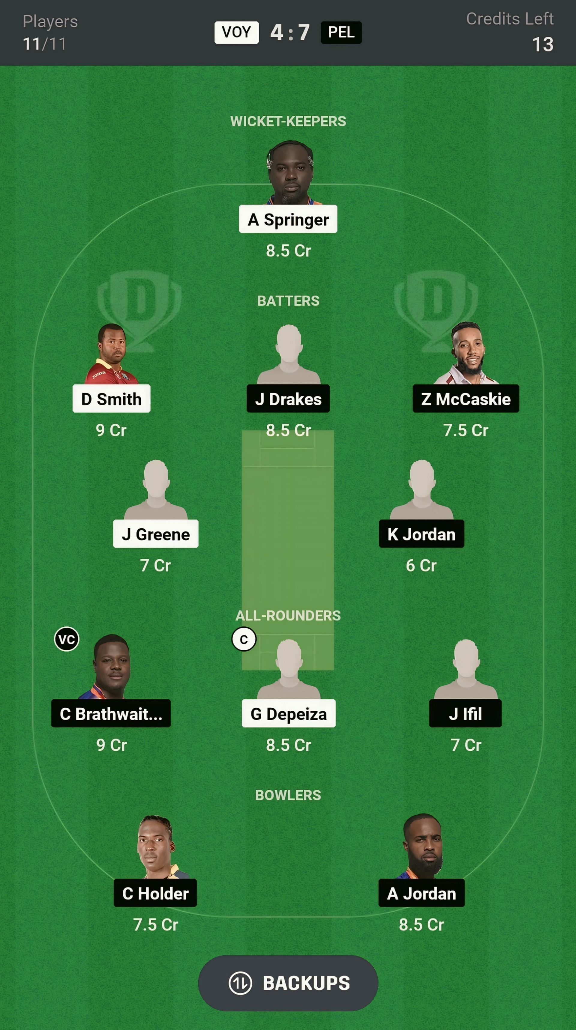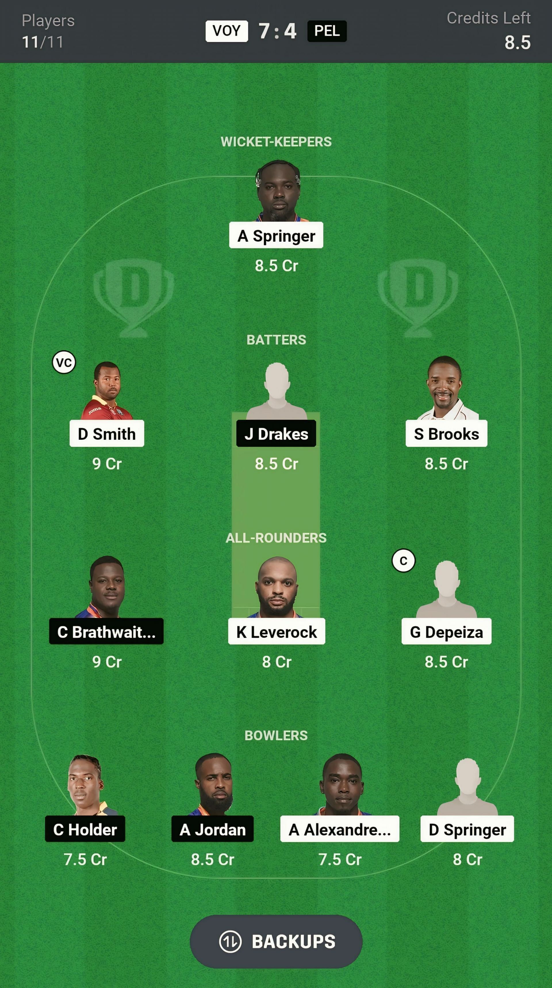 G Depeiza is the most crucial pick from Voyagers as the pitch is expected to support both bowlers and batters. He will bat in the top order and complete his quota of overs in today's match. He has smashed 37 runs and taken two wickets in the last two matches.