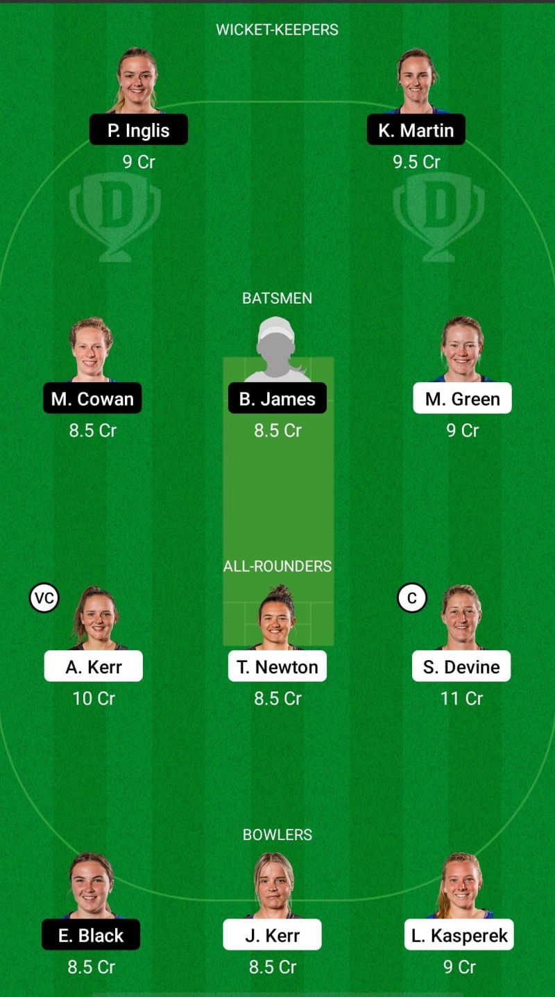 Fantasy Suggestion #1: Polly Inglis, Katey Martin, Millie Cowan, Bella James, Maddy Green, Sophie Devine, Amelia Kerr, Thamsyn Newton, Emma Black, Jess Kerr, Leigh Kasperek.