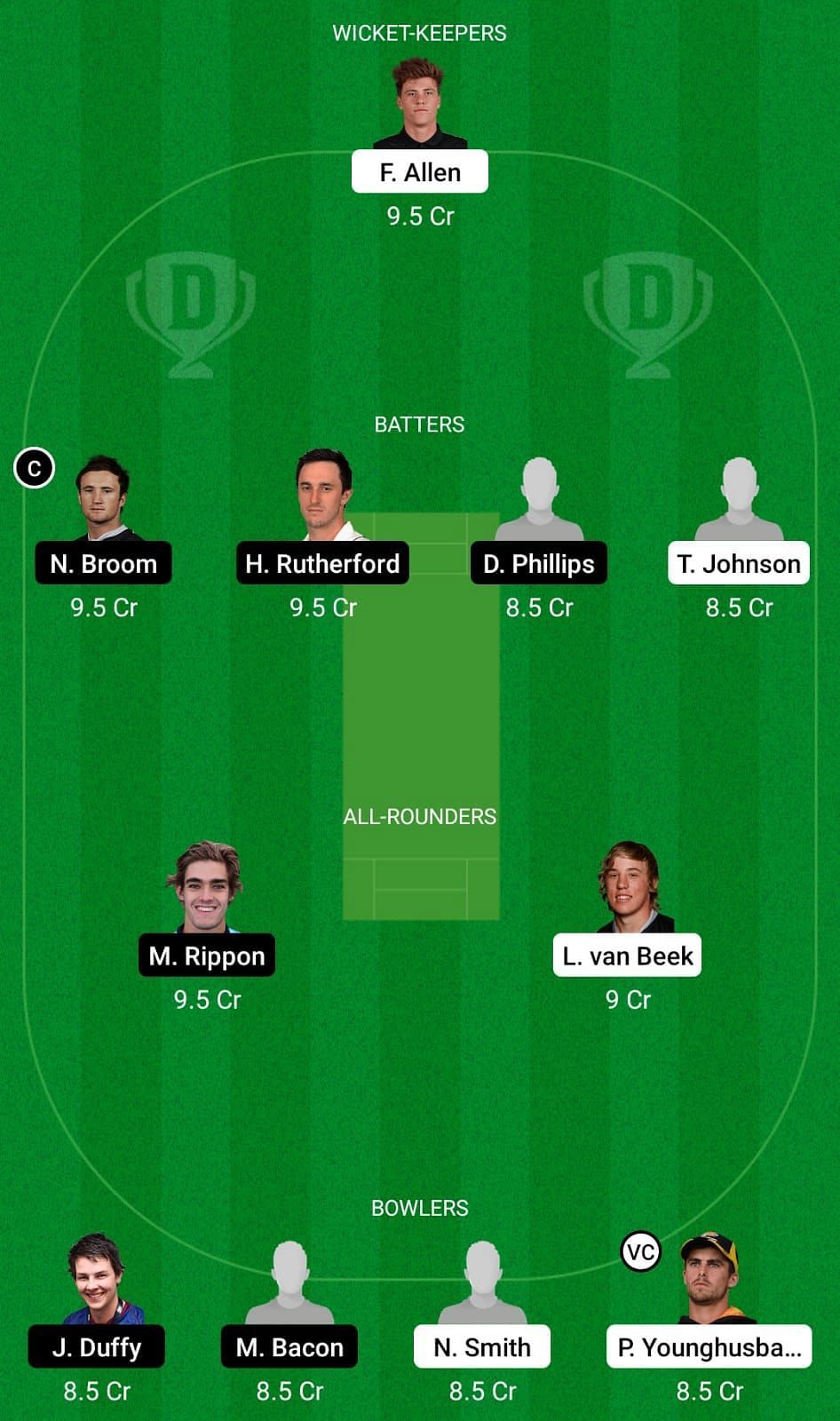Fantasy Suggestion #2: Fin Allen, Neil Broom, Troy Johnson, Logan Van Beek, Michael Rippon, Jacob Duffy, Peter Younghusband, Hamish Rutherford, Dale Phillips, Matthew Bacon, Nathan Smith