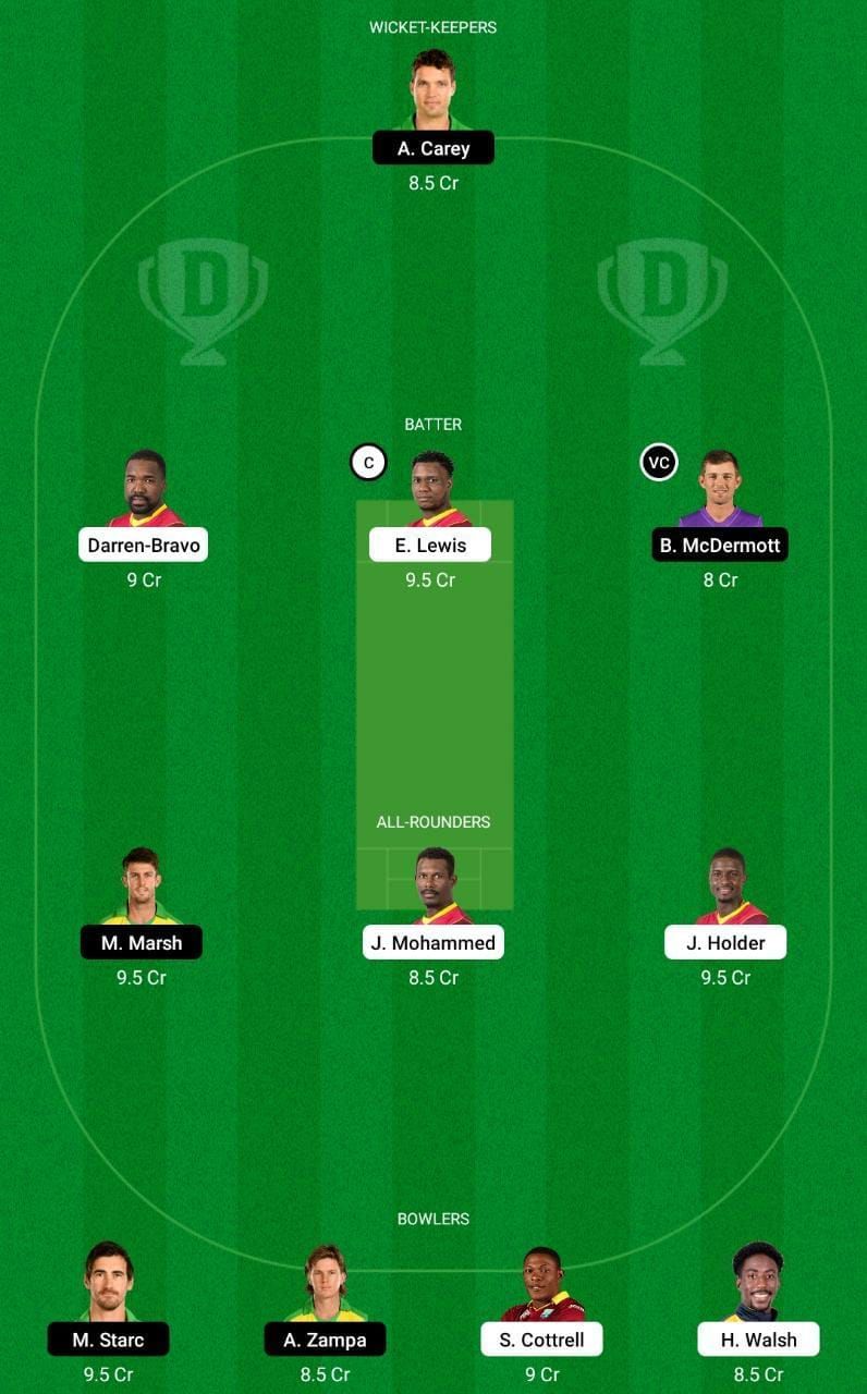 Fantasy Suggestion #2: Jason Mohammed, Alex Carey, Darren Bravo, Evin Lewis, Ben McDermott, Mitchell Marsh, Jason Holder, Mitchell Starc, Adam Zampa, Sheldon Cottrell and Hayden Walsh
