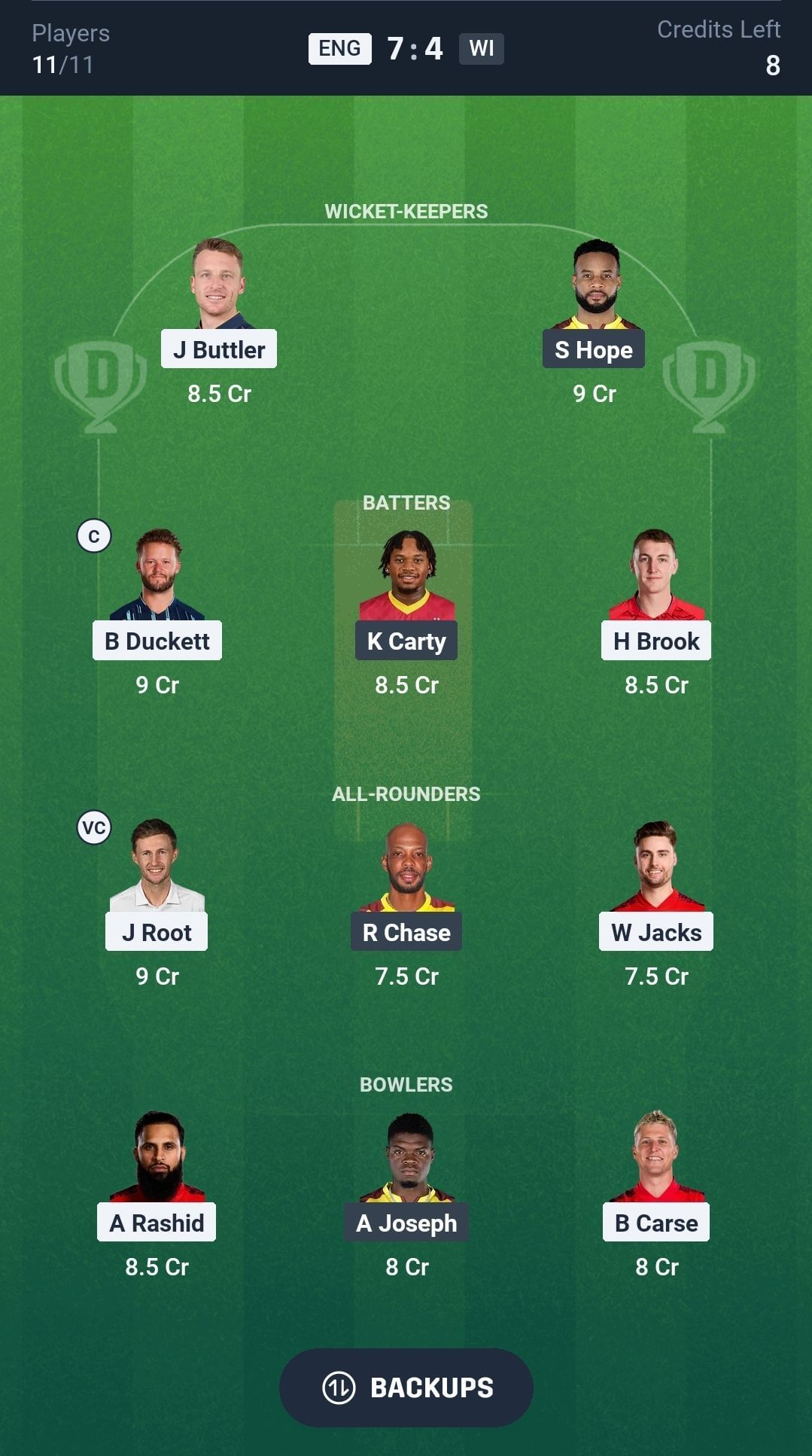 Harry Brook and Ben Duckett are the two best batsmen picks for today's Dream11 team. Ben Duckett is a hard hitter who can smash a lot of runs in today's match. He can play a good innings against the West Indies. He has smashed 1058 runs in 22 ODI matches. Keacy Carty is another good batter for today's match.