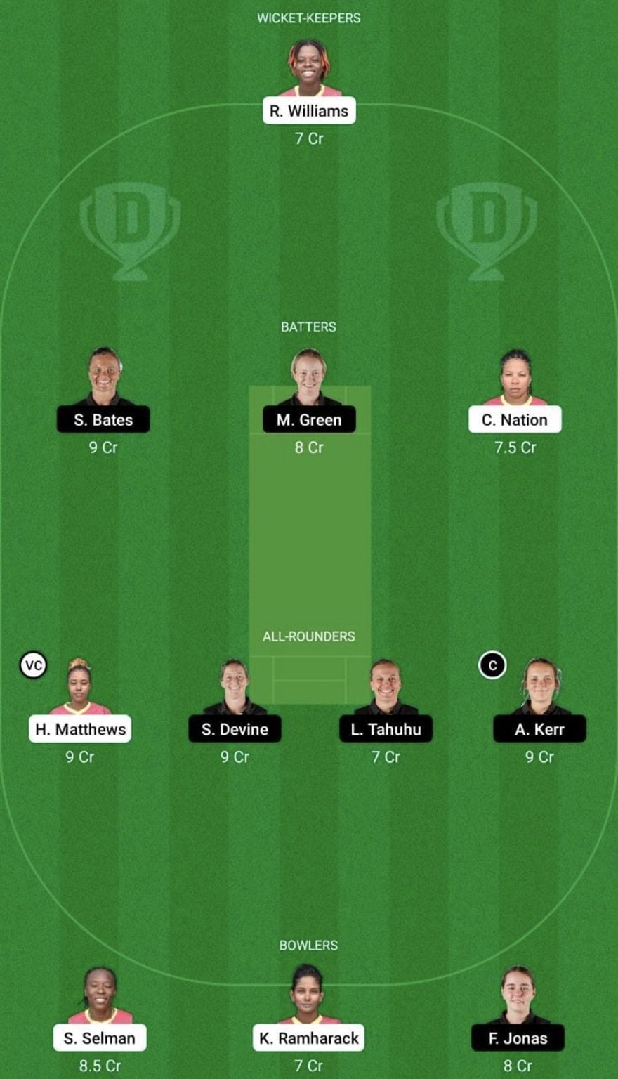 All-rounders: Hayley Matthews, Sophie Devine (c), Lea Tahuhu, Amelia Kerr (vc)