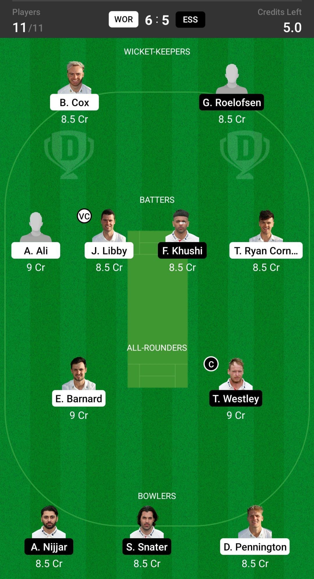 Fantasy suggestion #1: B Cox, G Roelofsen, A Ali, F Khushi, J Libby, T Ryan, T Westley, E Barnard, A Nijjar, S Snater, D Pennington