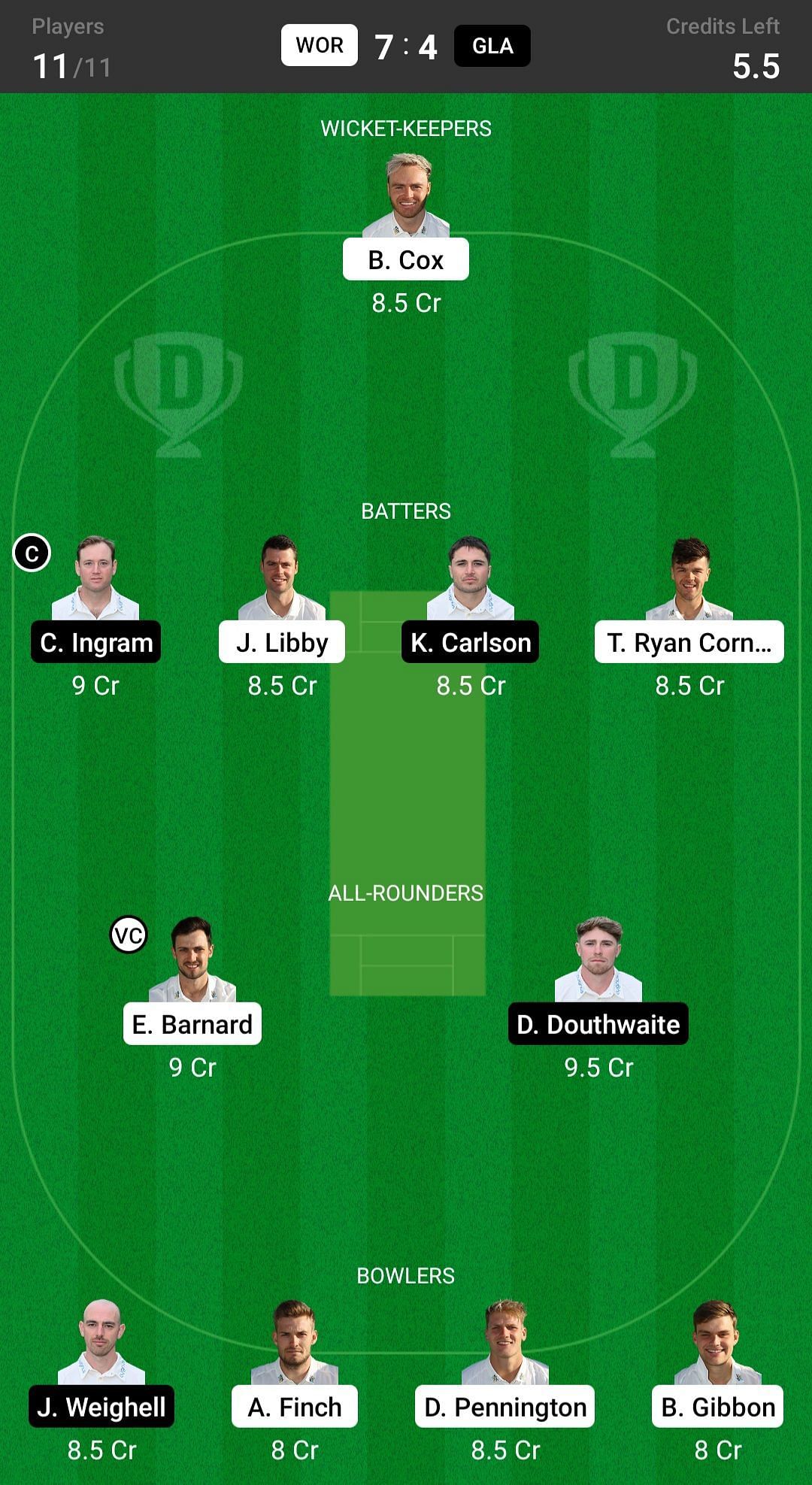 Worcestershire vs Glamorgan Dream11 Prediction Today, Grand League
