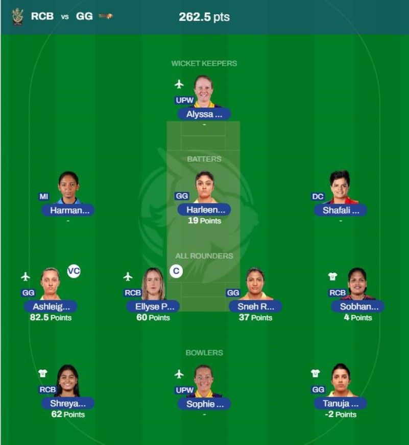Players playing in Match 16: Harleen Deol (BAT) (GG) (8 Credits), Ashleigh Gardner (GG) (ALL) (10.5 Credits), Sneh Rana (ALL) (GG) (8.5 Credits), Shreyanka Patil (BOWL) (RCB) (5.5 Credits), Ellyse Perry (ALL) (RCB) (10 Credits), Asha Shobana (ALL) (RCB) (5.5 Credits), and Tanuja Kanwar (BOWL) (GG) (6 Credits).