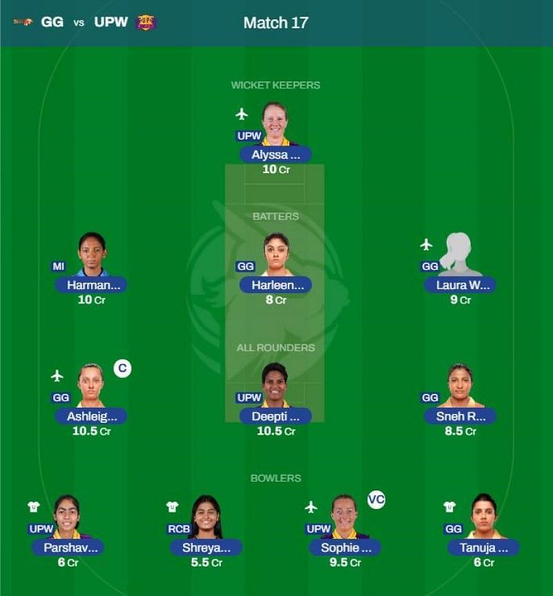Players playing in Match 17: Sophie Ecclestone (BOWL) [UPW] (9.5 Credits); Deepti Sharma (ALL) [UPW] (10.5 Credits); Laura Wolvaardt (BAT) [GG] (9 Credits); Sneh Rana (ALL) [GG] (8.5 Credits); Harleen Deol (BAT) [GG] (8 Credits); Ashleigh Gardner (ALL) [GG] (10.5 Credits); Parshavi Chopra (BOWL) [UPW] (6 Credits); Tanuja Kanwar (BOWL) [GG] (6 Credits), and Alyssa Healy (WK) [UPW] (10 Credits).