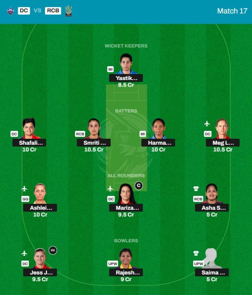 Players playing in Match 17: Jess Jonassen (DC) (9.5 Credits), Shafali Verma (DC) (10 Credits, Smriti Mandhana (BAT) (RCB) (10.5 Credits), Asha Shobana (ALL) (RCB) (5 Credits), Meg Lanning (BAT) (DC) (10.5 Credits), and Marizanne Kapp (ALL) (DC) (9.5 Credits).