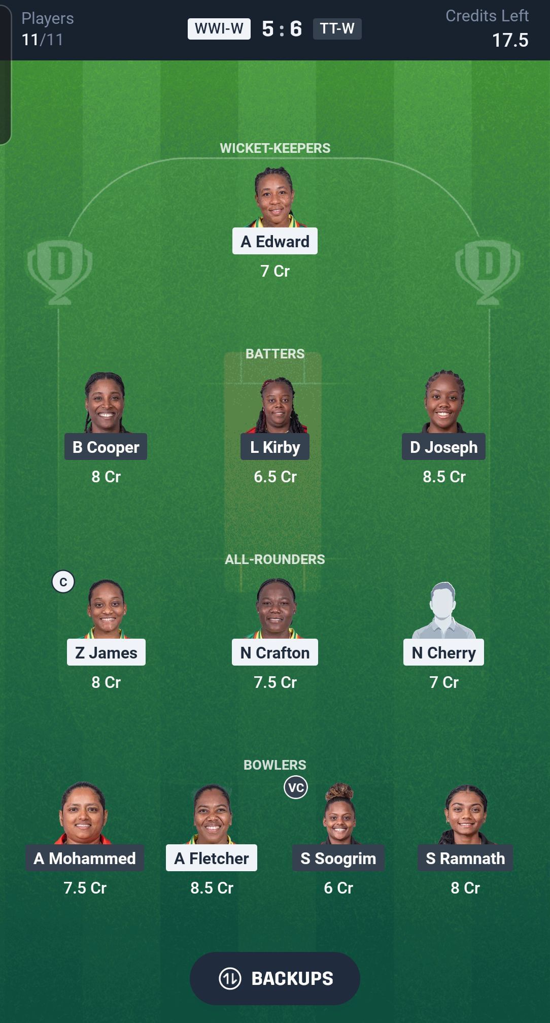 N Cherry and Z James are the best all-rounder picks for the Dream11 team. Both will play a crucial role for their teams in today's match. Z James will bat in the top order and complete her quota of overs. She has smashed 24 runs in the last two matches. N Crafton is another good all-rounder pick for today's match.