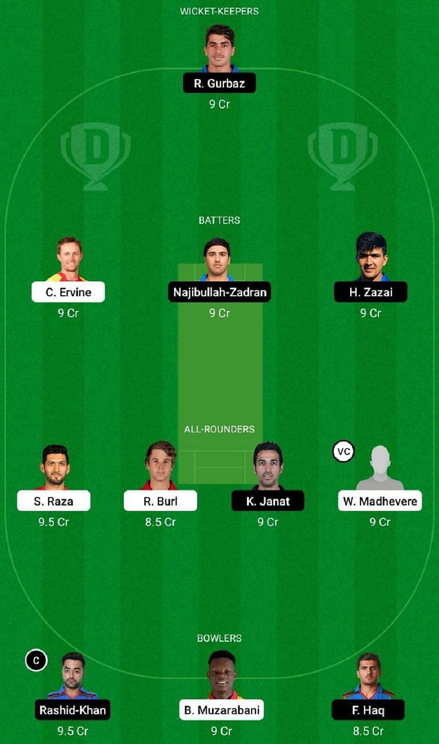 Fantasy Suggestion #1: R Chakabva, R Gurbaz, H Zazai, N Zadran, C Ervine, M Nabi, S Raza, W Madhevere, R Khan, B Muzarabani and F Haq.