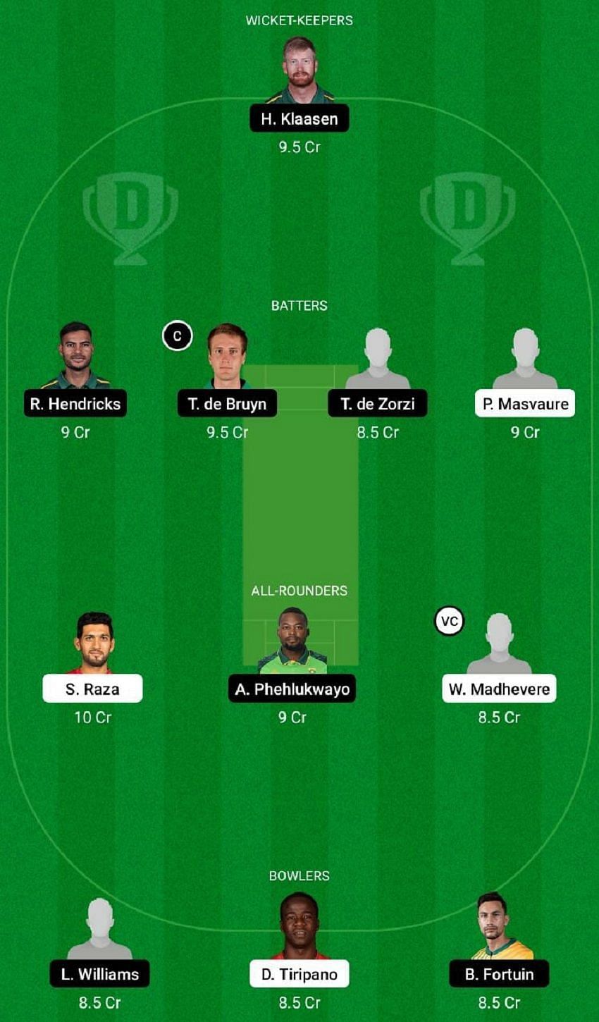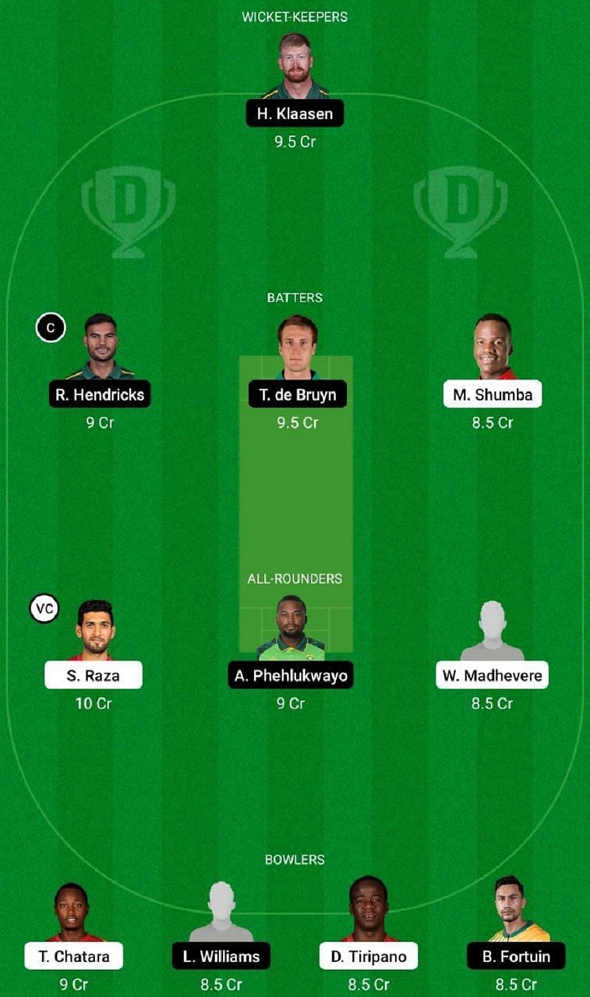 Fantasy Suggestion #1: H Klaasen, R Hendricks, T de Bruyn, M Shumba, S Raza, A Phehlukwayo, W Madhevere, T Chatara, L Williams, D Tiripano and B Fortuin.