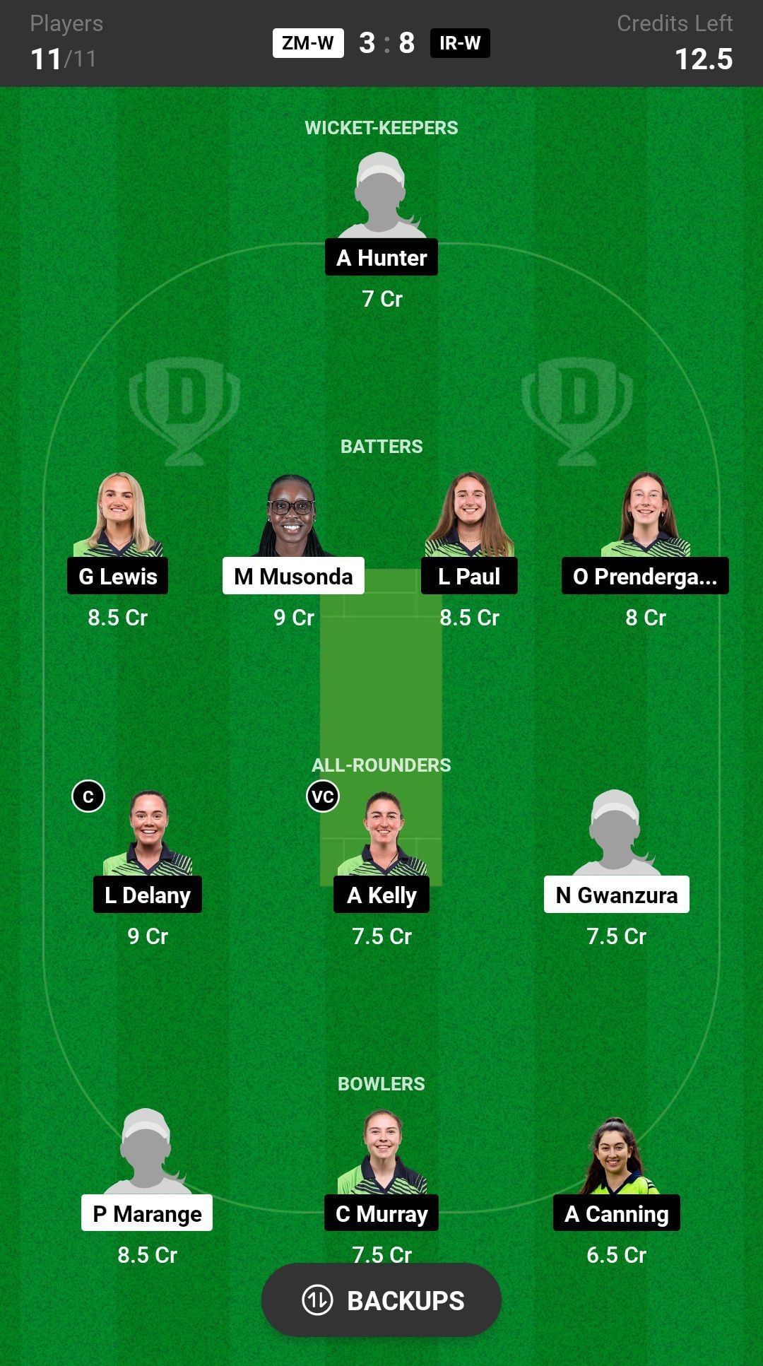 A Kelly and L Delany are the best all-rounder picks for the Dream11 team as they are batting in the middle order and also completing their quota of overs. N Gwanzura is another good all-rounder pick for today's match.